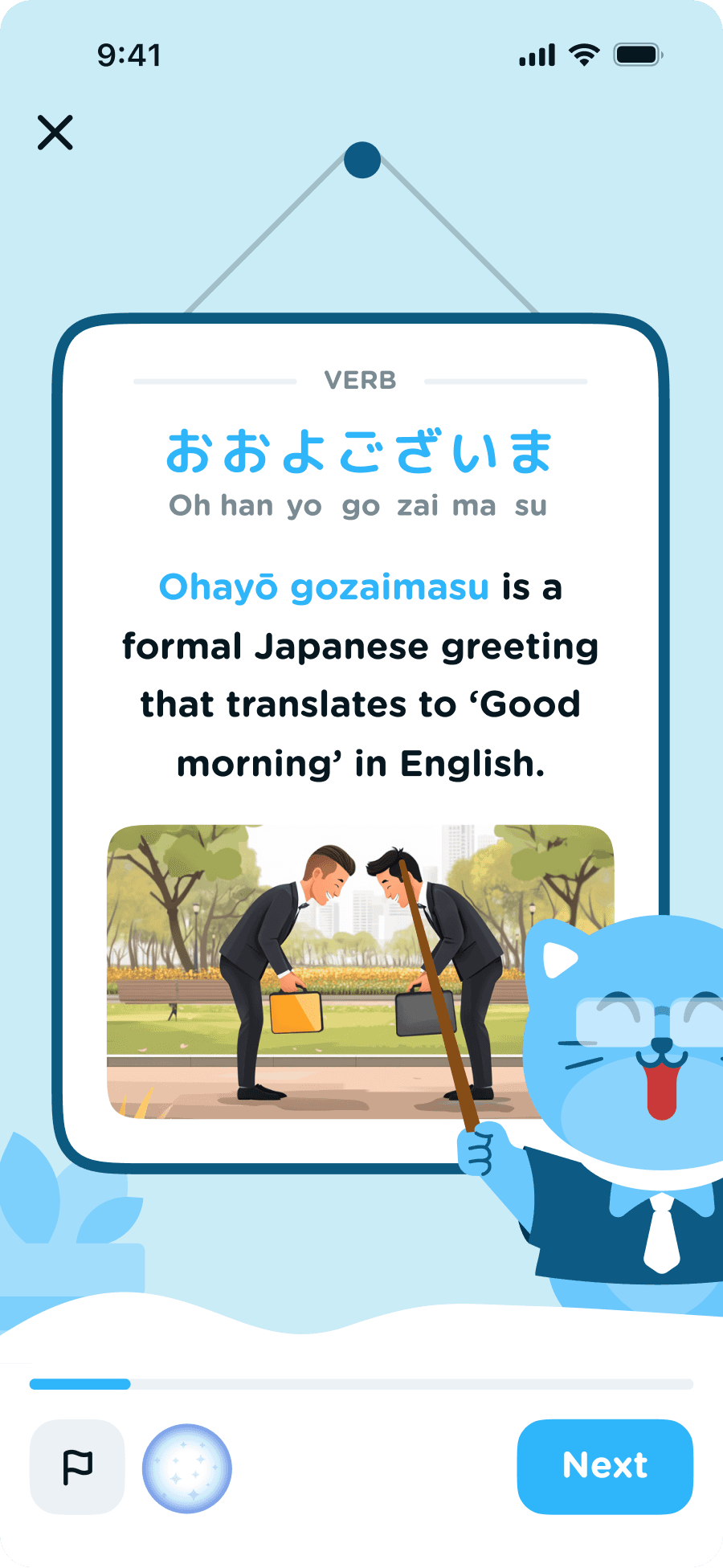 おはよう (ohayō) is a casual Japanese greeting that translates to ‘good morning’.