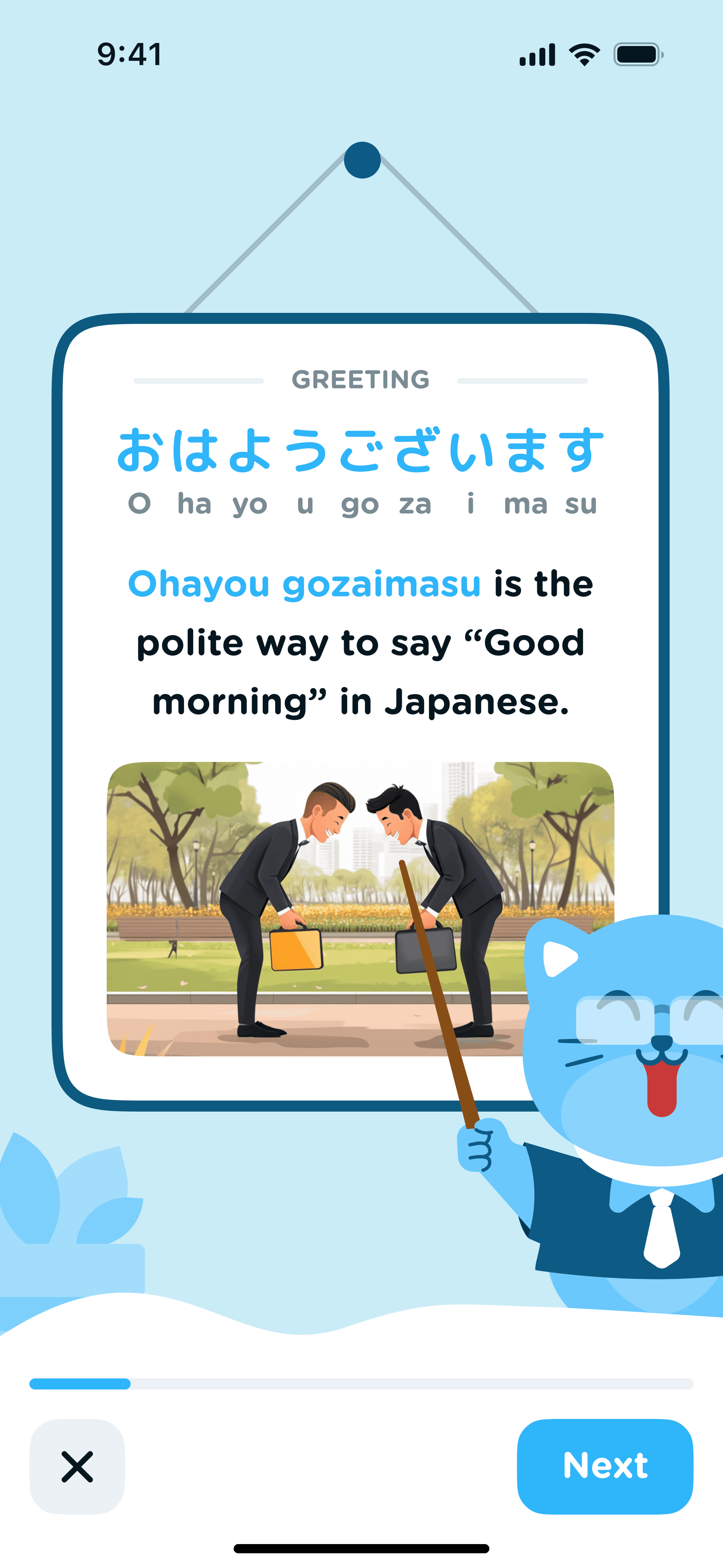 おはよう (ohayō) is a casual Japanese greeting that translates to ‘good morning’.